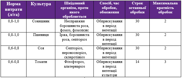 Системний фунгіцид для захисту пшениці, соняшнику, сої, томатів від широкого спектру збудників хвороб.