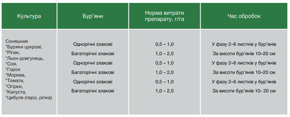 - завдяки продовженому терміну дії може використовуватися в широкому діапазоні фаз росту сільськогосподарських культур і бур’янів